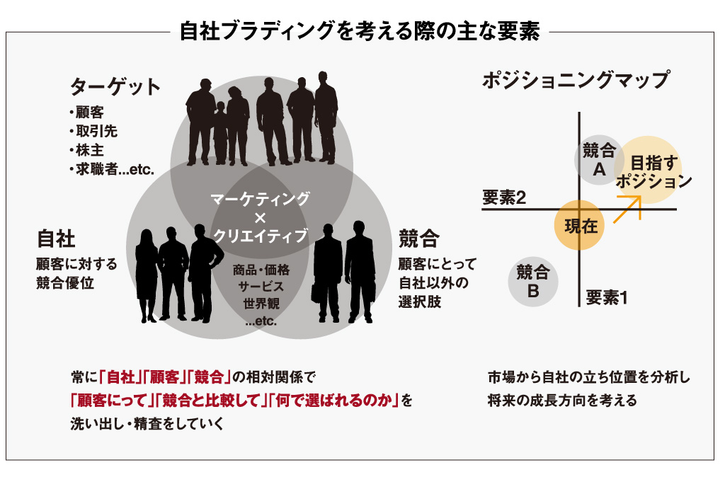 企業の想いや強みを「顧客」と「競合」の軸で精査し、より魅力的に伝わる言葉とデザインで可視化します。