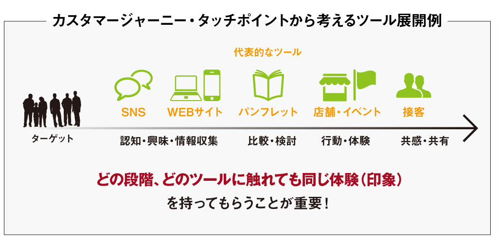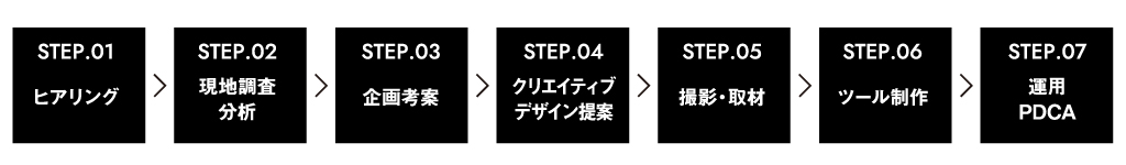 必要に応じてターゲットの嗜好、競合の動向を分析しながら全体を通して「企業の強みをどう見せるか」を固めていき、具体的なツール制作へと進めていきます。