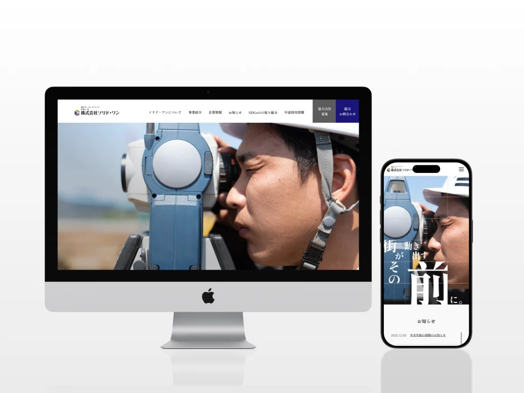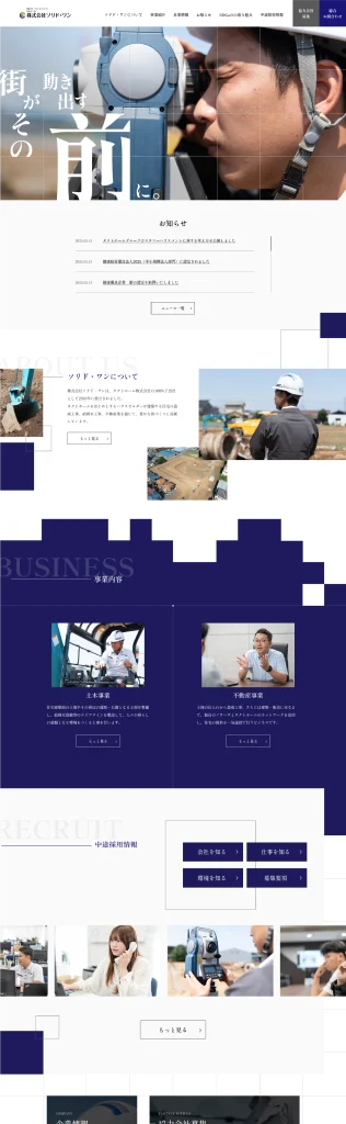 TOPの見出しでは「家が建ち、街が動きはじめる──その前の大切な工程」を担っているという意味を込めました。グリッドに沿った構成は、ズレを許さない正確さ・地盤づくりの几帳面さを視覚的に伝えるものになっています。全体のトーンは明朝体と落ち着いた配色を用いることで、誠実・真面目といったイメージを訴求。また事業内容のセクションでは、ガタガタのブロックが徐々に整っていくような構成にすることで、「造成により土地を整える」という業務そのものを表現しています。