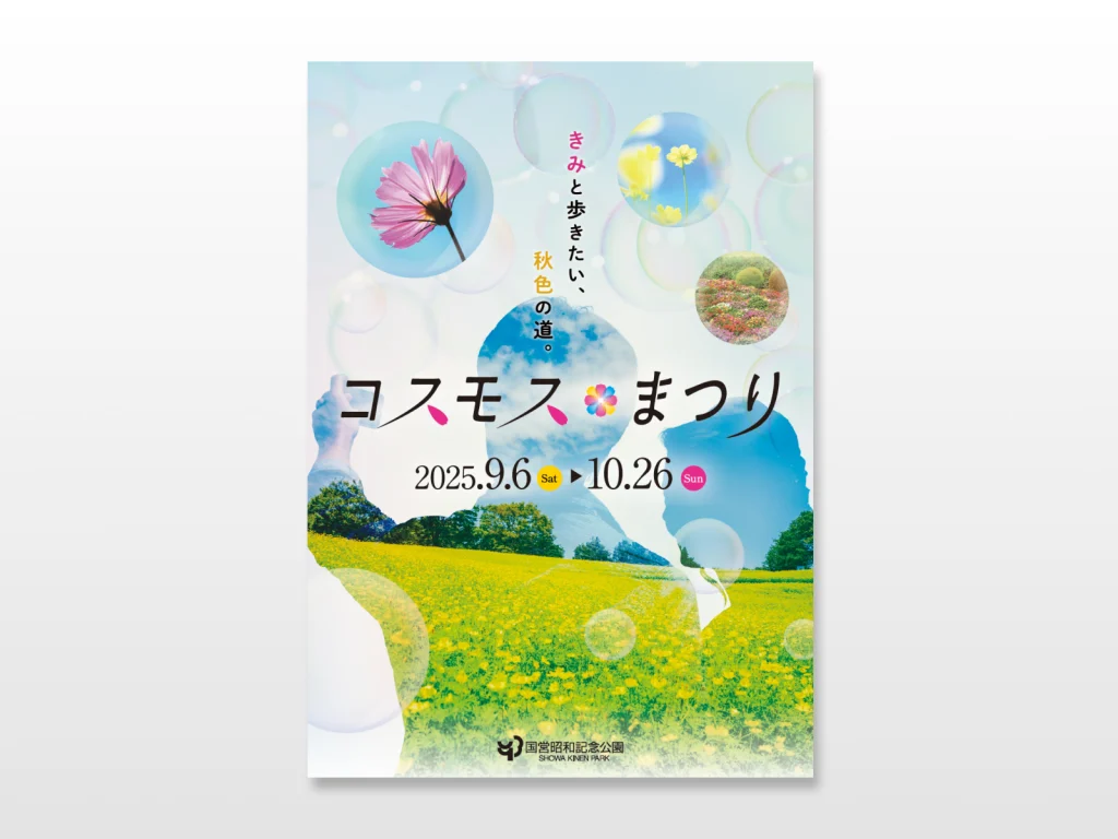 昭和記念公園で開催される「コスモスまつり」の魅力がひと目で伝わるよう、背景にコスモス畑を切り抜き、写真撮影を楽しむ2人のシルエットを重ねることで、来場者自身が花畑を楽しむ様子を自然に想起できる構成としました。広大な公園の特徴を活かすため、奥行きのある写真を使いスケール感も演出しています。また、花の紹介写真には、人気イベントの一つ「シャボン玉」を重ね楽しい雰囲気が伝わるよう工夫を施しました。