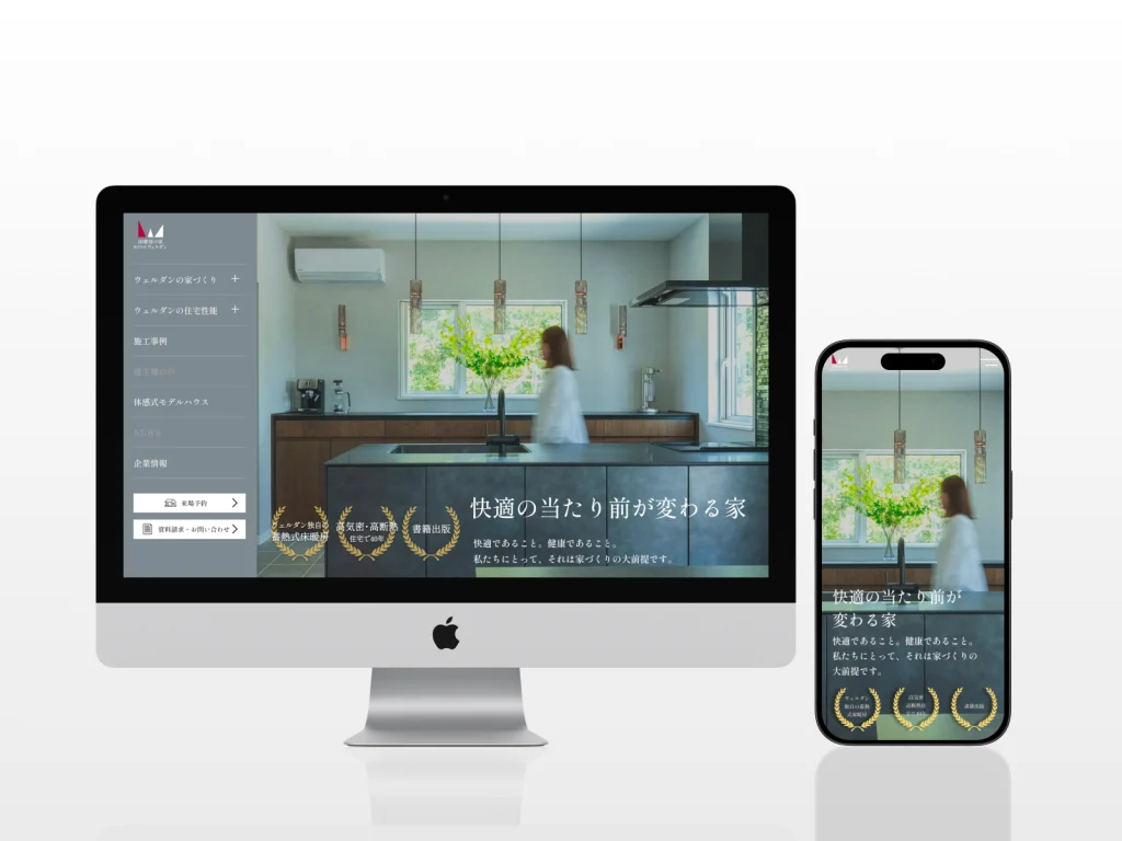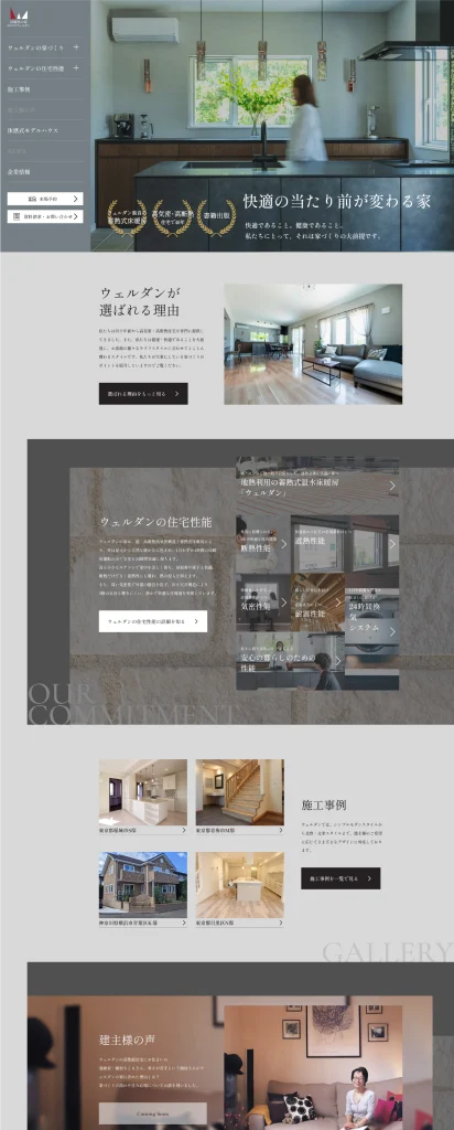 ファーストビューには複数の写真を切り替え表示させることで、ウェルダン様のモデルハウスの魅力を多角的に伝える構成にしています。実際の空間の雰囲気を全面に押し出すことで、幅広いお客様に「実際に見てみたい」と思っていただけるような誘導性の高いデザインに仕上げました。