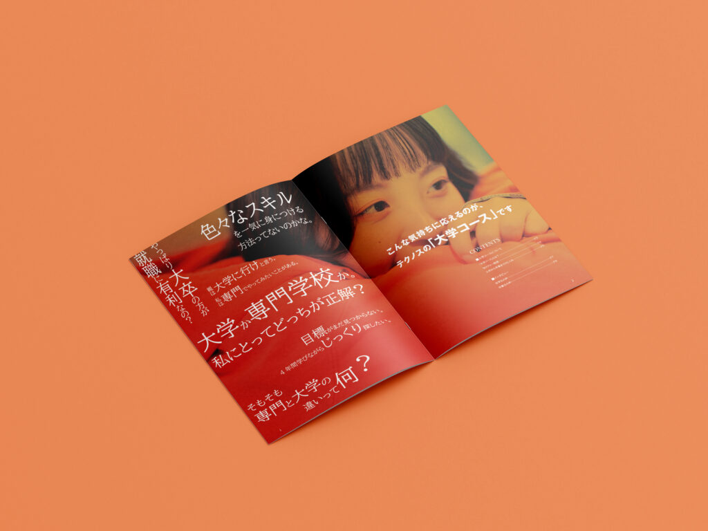 デザイナーK:母校である、テクノスカレッジ様のパンフレットを担当でき、とても光栄に思います。